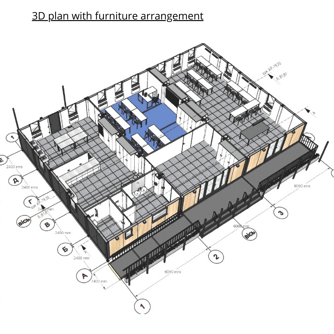 The educational temporary space consists of three main rooms: a chef’s workshop, a mechanic’s workshop and a classroom for theoretical studies. The purpose of these premises is described in detail in the section ‘Technological solutions’ of the explanatory note.