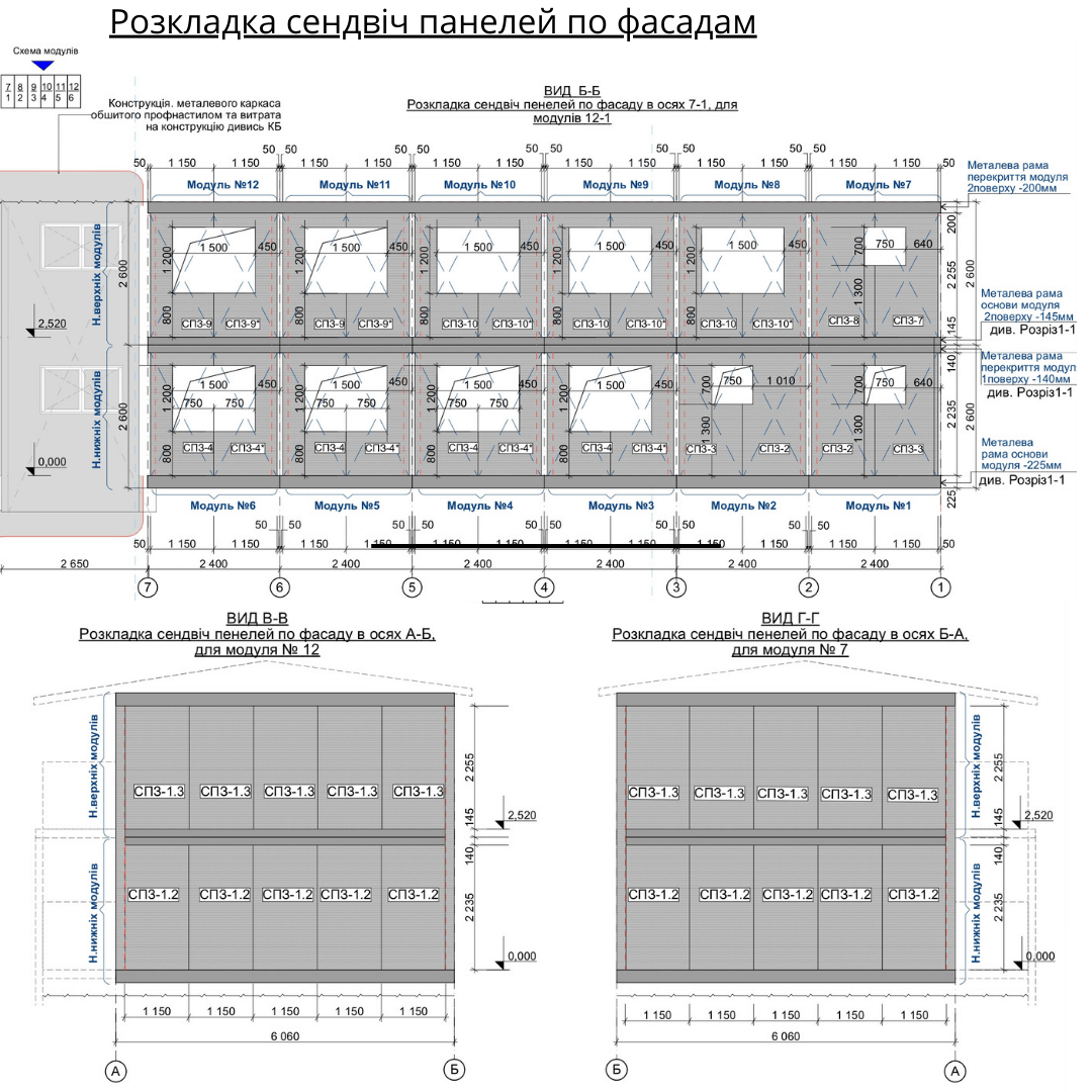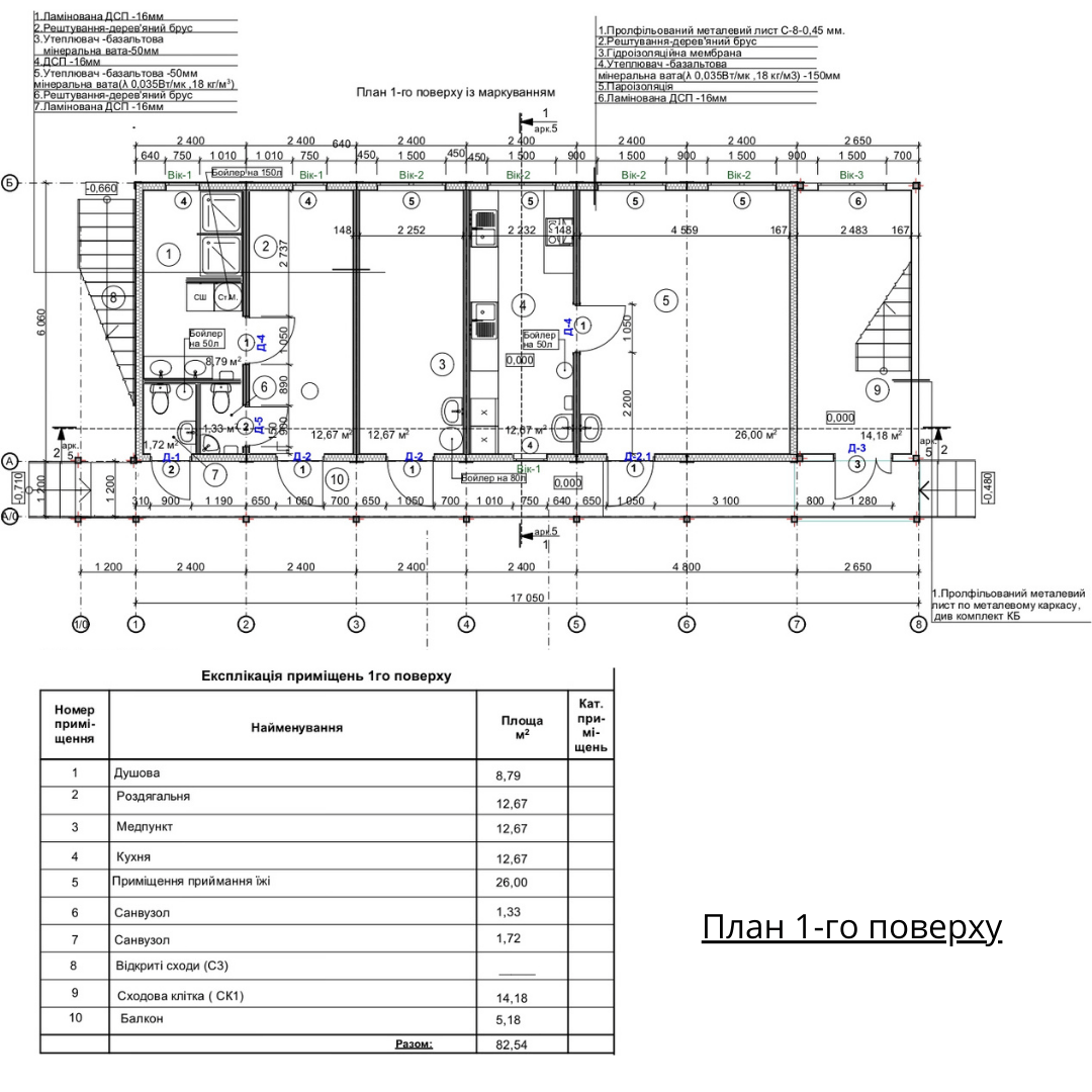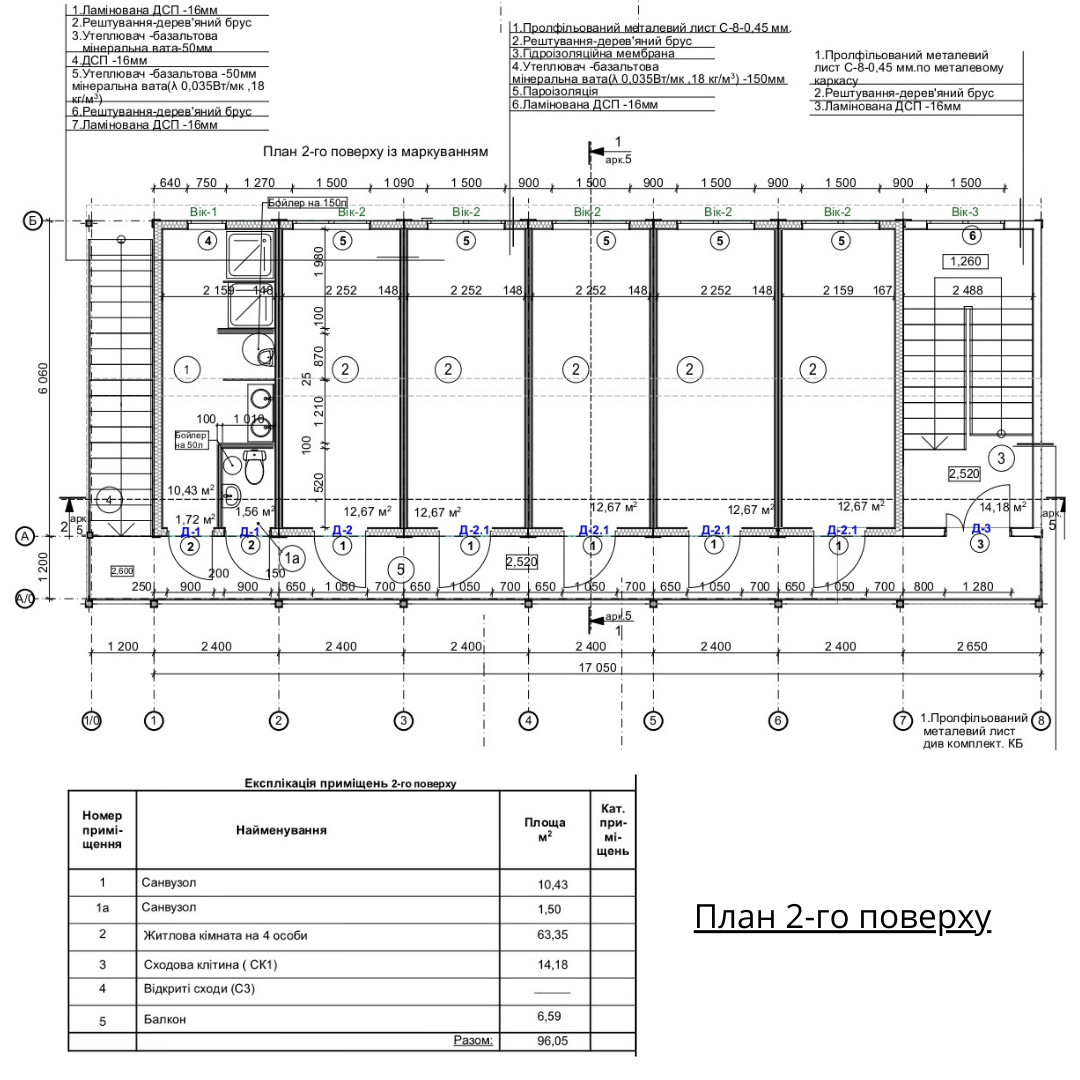 Сендвіч -панель типу АлюТерм С складається із зовнішнього боку- із металевого профільованого або гладкого листа,всередині- утеплювач із мінераловатних плит, із боку приміщень-ДСП-16мм ,або гіпсокартон із керамічною плиткою в санвіузлах та медпункті. Товщина мінераловатного утеплювача прийнята згідно із прорахунком . Дивись креслення АР.
