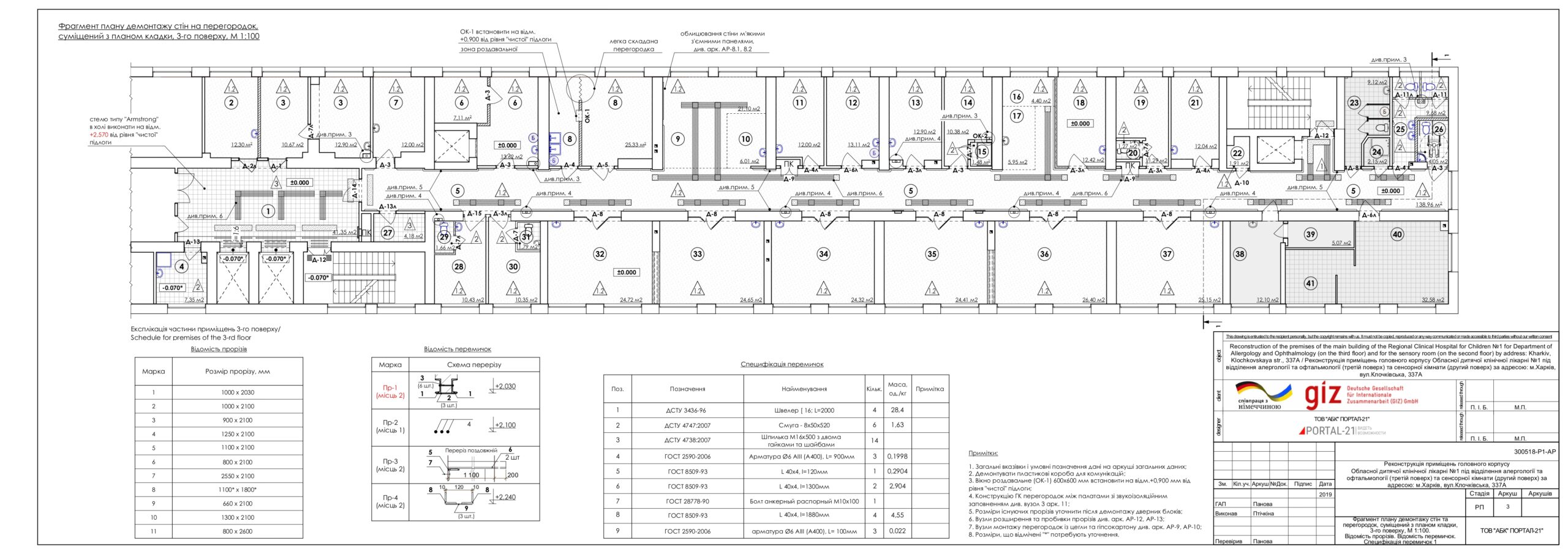 Перепланування передбачає демонтаж частини існуючих перегородок і заміну їх новими з силікатної та керамічної цегли і гіпсокартону. Крім того, в існуючих цегляних стінах створюються нові дверні прорізи. Армування ділянок стін показано на проектних кресленнях частини AW.